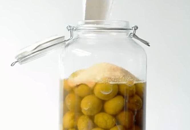 摇晃滚动玻璃瓶,让粘稠的蜂蜜均匀沾到青梅表面。